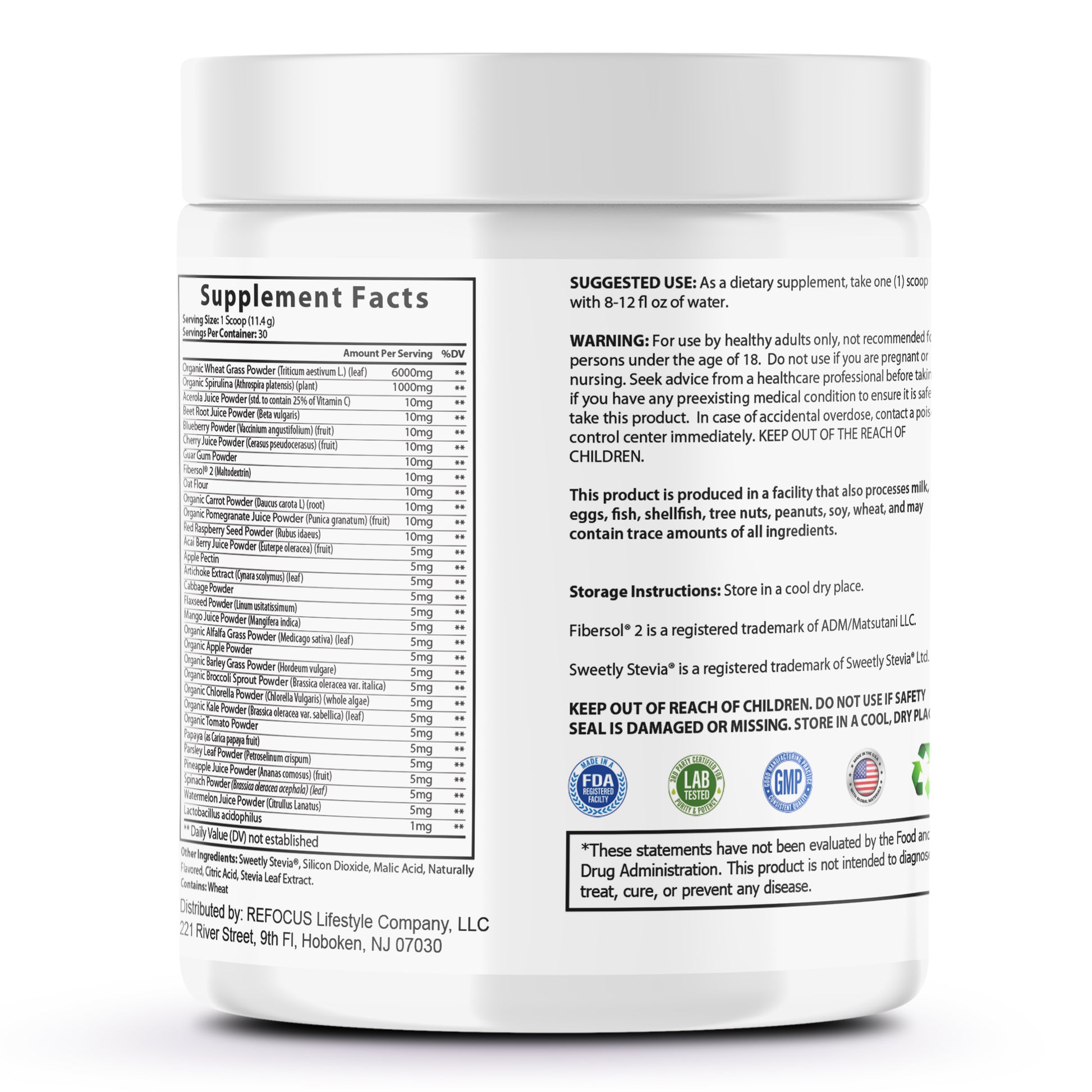 Organic GreensImmune SupportPrebiotic Digestive BlendBoosts Energy & VitalityStrengthens Immune DefenseAlkalized & Detoxifies15 Calories Per ServingNon-GMOGluten-freeLactose-free0 Added SugarsNo Artificial FlavorsNo artificial colorsNo artificial sweeteners